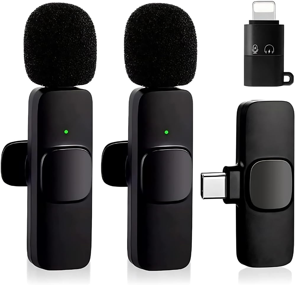 Microfone de Lapela Sem Fio Bluetooth Kit 2 Microfones Abafamento de Ruído Até 10 Horas Tempo de Trabalho Compatível com Câmera, iPhone, Android, PC – Conexão Android e USB-C – Linha AGold Premium